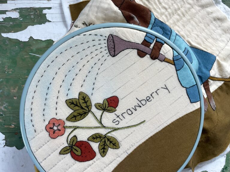 Earlier this year, I created an art quilt inspired by Richard Scarry’s Best Word Book Ever that came to hold more than I expected. What began as just a challenge slowly unfolded into something rooted in memory, healing, and the small, steady act of noticing. The Challenge Through the month of January and into early February, I worked on creating an art quilt inspired by Richard Scarry’s Best Word Book Ever for the Cherrywood Fabric 2026 Art Quilt Challenge. The theme was Storytime – which was described as holding a sense of connection, imagination, and nostalgia inspired by childhood story time. For the challenge, each artist works within a curated palette of Cherrywood hand-dyed fabrics to create their art quilt. For the Storytime theme, the palette felt vintage and full of gorgeous, earthy colors that immediately made me think of the original Frog and Toad books: rust, mango, goldenrod, caramel, sepia, lizard, misty, aqua, and jade. I also chose to incorporate the optional Sketchbook bundle – charcoal, taupe, mahogany, and buttercream to bring in some neutrals. This was my first time working with Cherrywood fabrics, and I absolutely love them. I’ve already started using them in other projects because they’re easy to work with and feel so good in my hands. The challenge uses a juried selection process to assemble a collection of about 250 art quilts that best represent Cherrywood’s vision for the year’s theme. Of course, that’s exciting but when I began, I wasn’t even thinking about selection. I just wanted to commit to something and see it through. Designing, completing, and submitting my piece became the goal and I’m happy to say that I did. Inspiration, Childhood, and The Present Day When I began thinking about which book to draw inspiration from, I returned to one of my favorite childhood books – Richard Scarry’s Best Word Book Ever, originally published in 1963. It was the first book he both wrote and illustrated, and it has stayed with me since I was very young. As I worked with the Storytime palette, I saw how naturally it fit with the feeling of that book. I kept coming back to the pen and ink illustrations and the way they translated so easily into appliqué and line work. As a child, I would sit and carefully study those illustrations, noticing and naming everything on the page. It felt like an early form of reading – learning the world by paying attention to it. When I became a mother, I found a copy to share with my boys and watched them do the same thing, drawn in by the animals and their busy lives. They lingered over the pages, taking it all in, just like I did. As I worked on this piece, I found myself returning to that way of seeing and reconnected with that feeling while also honoring something more recent. Last year, just before my breast cancer diagnosis, our family began creating a large monarch waystation in our front yard. When I received my diagnosis in early April, so many plans for the year changed but we held onto that garden. Together, we built a space where the wildness of living things could thrive and be supported. With each round of chemo, it became harder for me to do much in the garden, but it was always one of the first places I returned to as I began to feel better. I spent hours there noticing – watching the flowers bloom, the bees and butterflies and birds that came and went. It gave me something steady to return to, something full of life and beauty to connect to when, at times, life felt really, really hard. As I brought that garden into this piece, I felt the meaning of it more clearly – bringing together childhood, motherhood, and healing in one place. And through its creation, I reminded myself, over and over, that it’s going to be okay. The Process I hesitated to commit to this challenge when I first heard about it, mostly out of fear – the fear of not following through, of setting an intention and not being able to meet it because of my health, my energy, or even my lack of skill. I didn’t want to face another unfinished project. But after thinking about it every day for months, I finally decided to move forward. I ordered the fabrics and the companion Aurifil threads. At first, I chose fat quarters, but I quickly realized they wouldn’t be enough. I needed more of certain colors – especially sepia and lizard – which led to a spontaneous trip to Sew Yeah Quilting in Las Vegas, Nevada to pick up the half yard bundle. I was so grateful that they had it! I began the design process on my living room wall, taping up large sheets of brown butcher paper with blue painter’s tape. At first, I just needed to see what a 20″ x 20″ space actually looked like. From there, I drew out the elements, scanned them in, printed them at different sizes, cut them out, taped them up, and moved them around – stepping back often to study the composition before adjusting it again and again until it felt right. Early on, I knew I wanted a rabbit as the main character. In Richard Scarry’s garden spread, rabbits are shown at work, and I wanted to echo that same sense of life and movement. I chose to show my rabbit watering her plants with a hose – something I love to do in my own garden. When I began stitching, I worked daily, often for long stretches of time. There were days when I stitched for more than twelve hours. I bled for this piece. I developed callouses for this piece. For a time, it became the only thing I thought about. In the design, I included only the plants that grow here: morning glory, cosmos, strawberries, echinacea, salvia, and clover. I labeled each